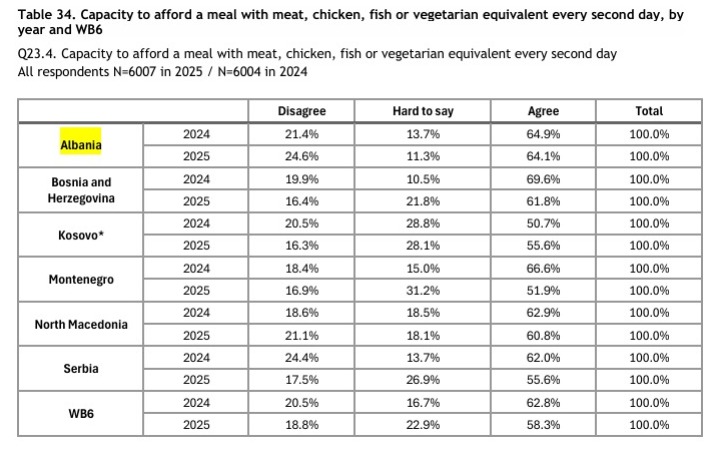 Në aspektin e ushqyerjes, Shqipëria shfaq situatë më të qëndrueshme. Vetëm 35% e qytetarëve nuk mund të ushqehen rregullisht ose të blejnë ushqime me vlera ushqyese, ndërsa në vendet fqinje kjo përqindje është më e lartë, duke treguar se përballimi i ushqimit mbetet një sfidë më e madhe jashtë vendit.