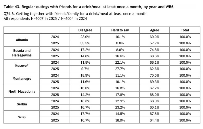 Kur bëhet fjalë për mundësinë për t’u mbledhur me miq ose familjarë për një pije apo një vakt të paktën një herë në muaj, Shqipëria del gjithashtu në fund të listës së vendeve të Ballkanit Perëndimor. Vetëm 57.7% e të anketuarve deklaruan se mund ta përballonin këtë aktivitet, ndërsa 33.5% thanë se nuk mund ta bënin, një rritje e ndjeshme nga 23.9% në vitin 2024. Të dhënat tregojnë se presioni financiar mbi familjet shqiptare është rritur dukshëm dhe shpenzimet bazike të socializimit po bëhen më të vështira për t’u përballuar.