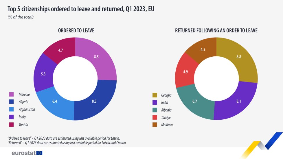 Në grupin e atyre që janë urdhëruar të largohen përherë të parë nga një vend i BE-së, dominojnë marokenët (9 500) përfaqësonin pjesën më të madhe të totalit (8,5%), të ndjekur nga algjerianët (9 275), afganët (7 120), indianët (5 885), dhe tunizianët (5 245).