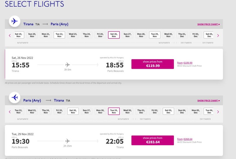 Një biletë vajtje për në Paris më linjën Wizz Air kushton rreth 120 euro ndërsa bileta e kthimit është akoma edhe më e shtrenjtë, deri në 284 euro.