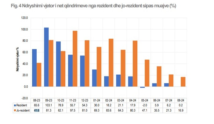 Njësoj si në muajin korrik, edhe gjatë gushtit hotelet janë ‘sabotuar’ nga turistët vendas. Netë qëndrimet e tyre u rritën me vetëm 0.2%, kur një vit më parë ishte 65.6%. Për jo rezidentët, ky tregues u rrit me 16.9% nga 41.6%.