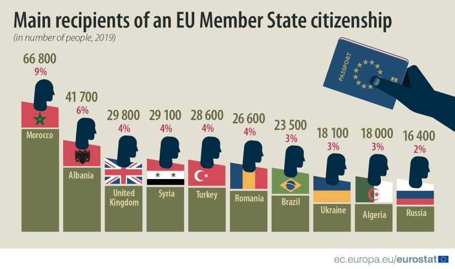 Sipas Eurostat, shtetet të cilatui ofruan shqiptarëve nënshtetësinë gjatë 2019-s janë: Gjermania, Italia, Franca, Spanja dhe Suedia. Që nga viti 2002, Eurostat numëron rreth 400 mijë pasaporta të dhëna për shqiptarët.