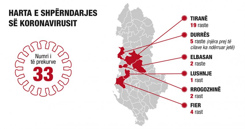 Në komunikimin e sotëm në media, zëvendësministrja e Shëndetësisë Mira Rakacolli dhe Drejtuesja e Departamentit të Sëmundjeve infektive në ISHP Silva Bino, treguan se janë testuar 457 raste dhe në total në vendin tonë ka 33 raste pozitive me COVID-19. Në njoftimin e tyre vihet re se harta me personat e prekur është zgjeruar edhe me qytetin e Fierit, ndërkohë që ekspertet bëjnë me dije se 8 prej të prekurve ndodhen në spitalin Infektiv, ndërsa 25 të tjerë janë vetizoluar dhe janë në gjendje të mirë shëndetësore.