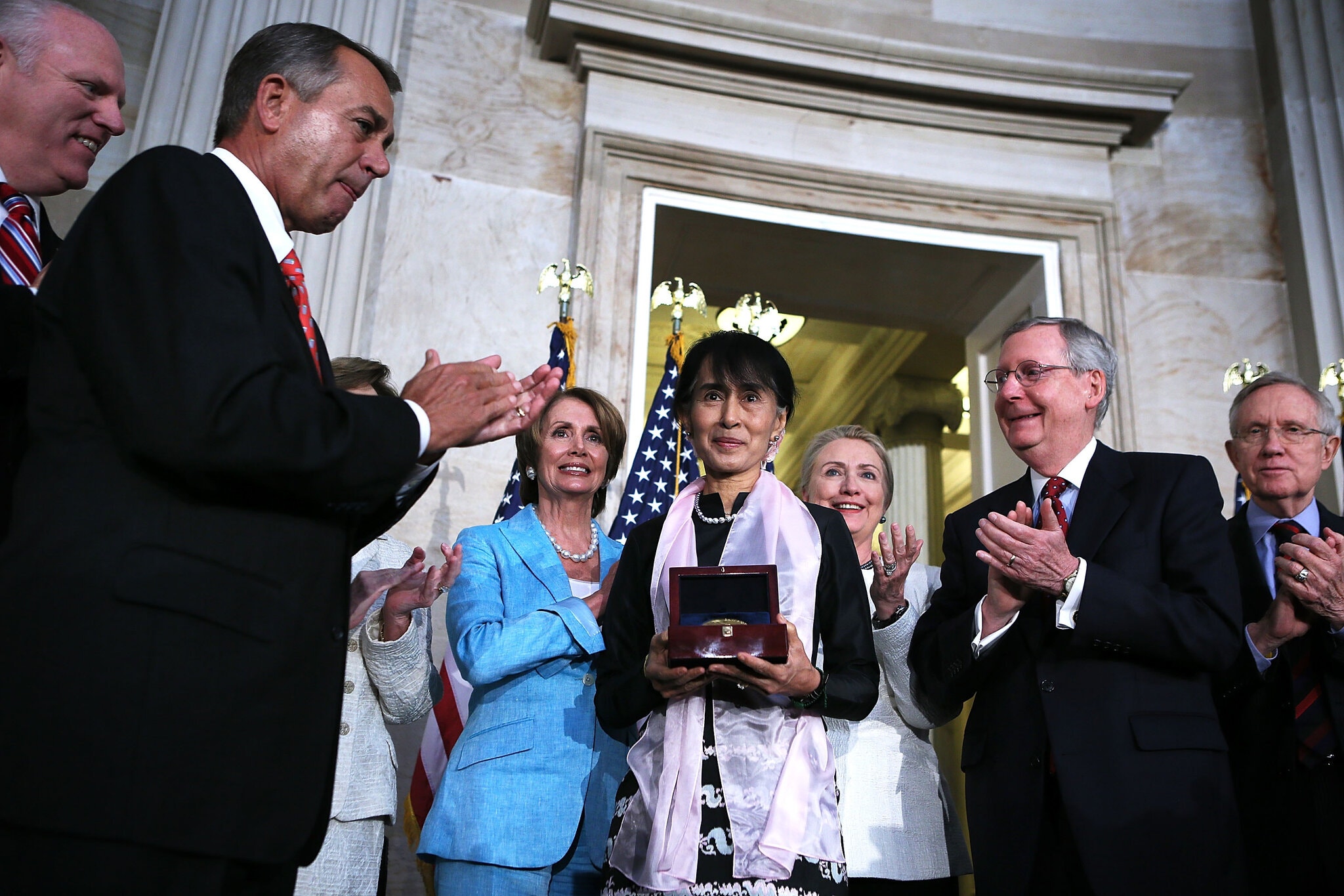 Një juntë ushtarake e arrestoi atë në 1989, pas së cilës Lidhja e saj Kombëtare për Demokraci fitoi zgjedhjet, që u injoruan nga diktatura. Më 1991-shin, ajo fitoi çmimin Nobel për Paqen “për luftën e saj jo të dhunshme për demokracinë dhe të drejtat e njeriut”.