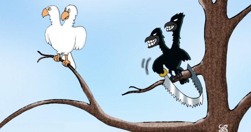 Dy shqiponjat dykrenare qëndrojnë në dy degë të ndryshme të së njëjtës pemë. Karikatura tregon se shqiponja serbe qëndron në një degë më të gjatë, më të shëndetshme dhe më të zhvilluar, duke nënkuptuar këtu ekonominë e Serbisë.