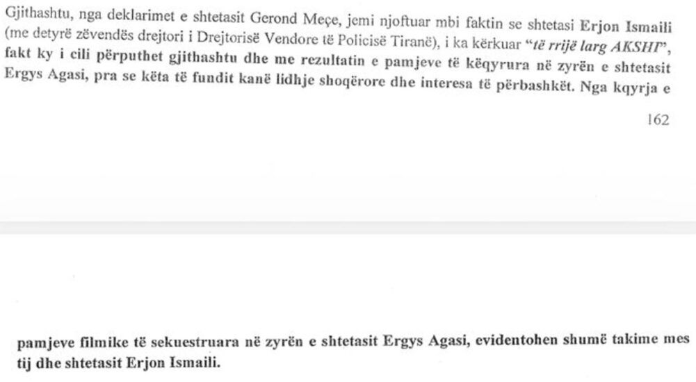 Hetuesit kanë zbuluar edhe rolin e zv.drejtorit të policisë së Tiranës, Ermal Ismaili si pjesë e grupit të strukturuar kriminal për tenderat e AKSHI. Biznesmeni Gerond Meçe ka treguar se para se ta merrnin peng, zv.drejtori i policisë i kishte kërkuar “të rrijë larg AKSHI-t”.