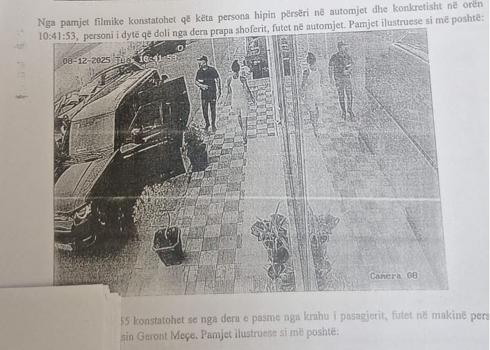 Më pas, ka parë brenda në makinë që ky person ka pasur të veshura xhinse të zeza. Në momentin kur e ka thirrur në emër personi i parë, Meçe ka shtypur butonin e bagazhit të makinës, i cili automatikisht ka filluar të mbyllet. Në këtë kohë kur po mbyllej bagazhi, është futur te sedilja mbrapa në mes e automjetit Defender.