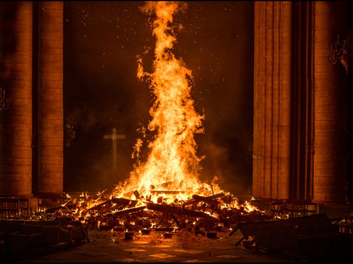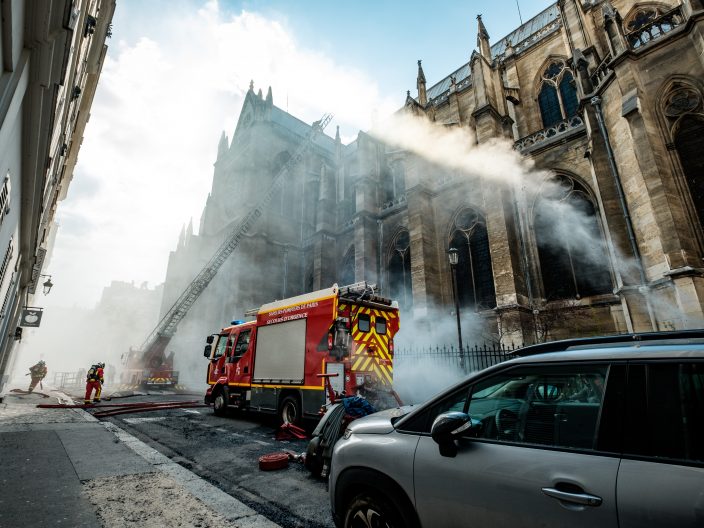 Një bisht cigareje e shuar keq, shkëndija nga kabllot elektrike të ekspozuara dhe një skelë tërësisht prej druri: në një sërë efektesh zinxhirë, kutia kryesore e zjarrit zhvillohet në papafingo të nefit qendror. Por për shkak të një sërë keqkuptimesh, kuptohet shumë vonë. Në të vërtetë, raportet e atyre që shohin tymin që del nga rruga e katedrales, mbërrijnë edhe para se të dërgohet alarmi. Aty është kaos, një garë me kohën për të shmangur humbjen e të gjithë strukturës dhe për të shpëtuar veprat që gjenden brenda saj.