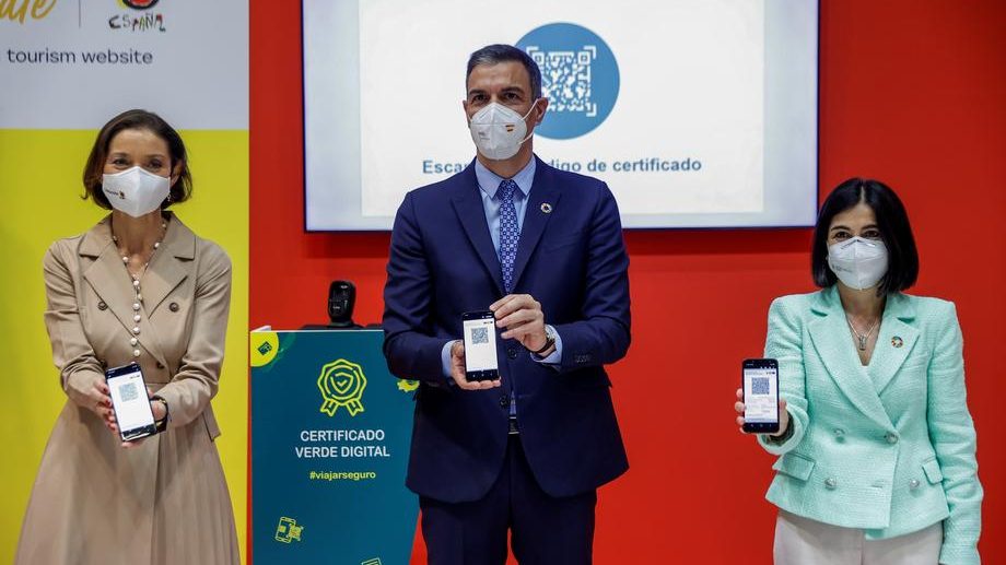 Kryeministri spanjoll Pedro Sanchez pranë Ministres së Shëndetësisë Carolina Darias gjatë prezantimit të Certifikatës se Vaksinimit në Panairin Ndërkombëtar të Turizmit
