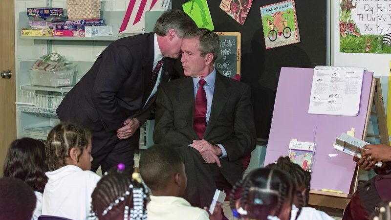 Më vonë, ndërsa Bush po u lexonte fëmijëve “Dhinë shtëpiake”, një tekst të hartuar për të praktikuar leximin, shefi i stafit të tij, Andrew Card, e ndërpreu për t’i pëshpëritur në vesh se një aeroplan i dytë kishte goditur kullat dhe se Shtetet e Bashkuara të Amerikës ishin “nën sulm”.
