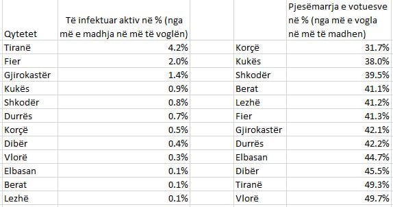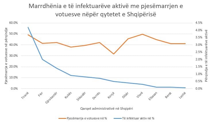 Të dielën më 25 Prill 2021 u zhvilluan zgjedhjet parlamentare 2021. Krahas pjesëmarrjes së lartë të votuesve duhet marrë parasysh dhe fakti që një pjesë e popullsisë është aktualisht e infektuar dhe nuk mundet që të votojë. Ne në gazetën “Si” jemi përpjekur që të shohim nëse ka ndonjë marrëdhënie midis pjesëmarrjes së votuesve nëpër qytete me të infektuarit aktivë me COVID-19. Në grafikun e mëposhtëm ne kemi treguar përqindjen e të infektuarve aktivë dhe përqindjen e pjesëmarrjes së votuesve në secilin qark administrativ të Shqipërisë.