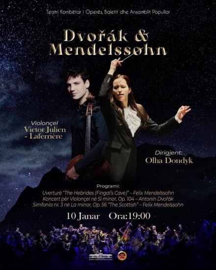 Në TKOBAP, muzika simfonike vjen që në fillim të vitit me një koncert të veçantë kushtuar Dvořák dhe Mendelssohn, ku në skenë ngjiten dy talente të rralla të skenës ndërkombëtare. Vetëm 19 vjeç, dirigjentja ukrainase Olha Dondyk shënon një tjetër moment të rëndësishëm në karrierën e saj, pas debutimit në janar 2024 me Orkestrën Filarmonike të Roterdamit.