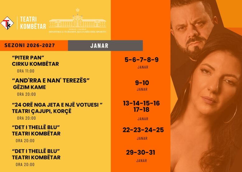 Ndërkohë, Teatri Kombëtar nis sezonin 2026–2027 me një program të pasur dhe të larmishëm gjatë gjithë muajit janar, duke përfshirë shfaqje për fëmijë, drama bashkëkohore dhe produksione nga teatrot kombëtare e rajonale. Shfaqje si “And’rrra e Nan’ Terezës”, “24 orë nga jeta e një votuesi” dhe “Det i thellë blu” e kthejnë skenën teatrale në një hapësirë dinamike dialogu me publikun. Po ashtu Cirku Kombëtar vjen në këtë prag viti me shfaqjen “Piter Pan” e cila do të shfaqet për publikun në datat 5-6-7-8-9 Janar.