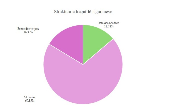 Tregu dominohet nga sigurimet e detyrueshme, të cilat përbëjnë rreth 62.4% të totalit të primeve, ndërsa sigurimet vullnetare zënë 37.6%. Po ashtu, sigurimet e Jo-Jetës, kryesisht ato motorike, përfaqësojnë mbi 91% të vëllimit të tregut.