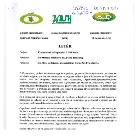 Shoqata e Eksportuesve Shqiptarë të Fruta-Perimeve, Këshilli i Agrobiznesit Shqiptar (KASH) dhe Sindikata e Fermerëve, kundërshtojnë propozimet e paketës fiskale 2022, në një letër drejtuar kryeministrit Edi Rama, ministres së Financave dhe Ekonomisë, Delina Ibrahimaj, dhe ministres së Bujqësisë dhe Zhvillimit Rural, Frida Krifca.