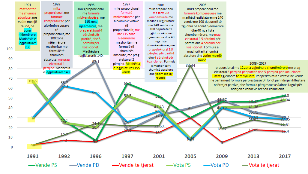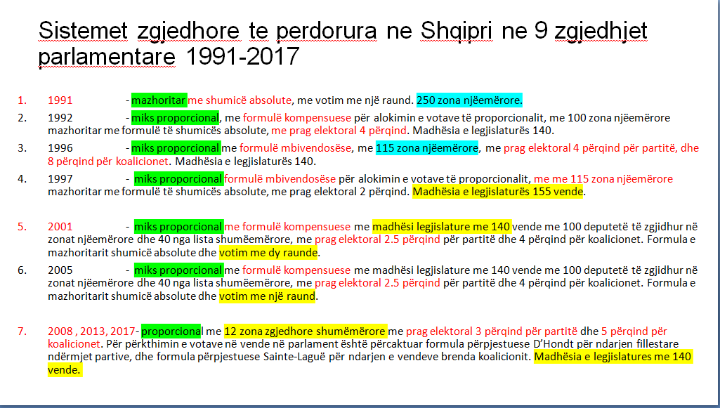 Ndërsa Fiorela Shalsi, eksperte mbi ekuilibrin gjinor në zgjedhje deklaroi në këtë tryezë se është në favor të sistemit proporcional ku listat të respektojnë barazinë gjinore dhe 50 përqind të jenë gra dhe 50% të jenë burra. Sipas saj më i vlerësuar për arritjen e barazisë gjinore dhe që gratë të kenë një përfaqësim të lartë në Parlament. Arjan Dyrmishi në diskutimin e tij paraqiti disa formula të sistemeve si dhe avantazhet që japin sistemet mazhoritar apo proporcional. Për arsye se sistemet mazhoritare i japin partive të mëdha shumicën e vendeve në Parlament edhe kur ato nuk marrin shumicën e votave ato ndikojnë mbi përfaqsueshmërinë pasi prodhojnë shpërpjetueshmëri të lartë. Kjo ka ndikim të drejtpërdrejtë mbi numrin e partive pasi sa më e lartë të jetë shpërpjetueshmëria, aq më shumë zvogëlohet numri i partive që hyjnë në Parlament. Të gjithë sistemet elektorale prodhojnë shpërpjetueshmëri, por në sistemet proporcionale shpërpjetueshmëria është më e ulët”, theksoi Dyrmishi.