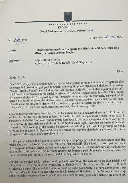 Bardhi tha se është kërkuar një interpelancë urgjente me ministren e Shendetesise, Albana Koçiu.