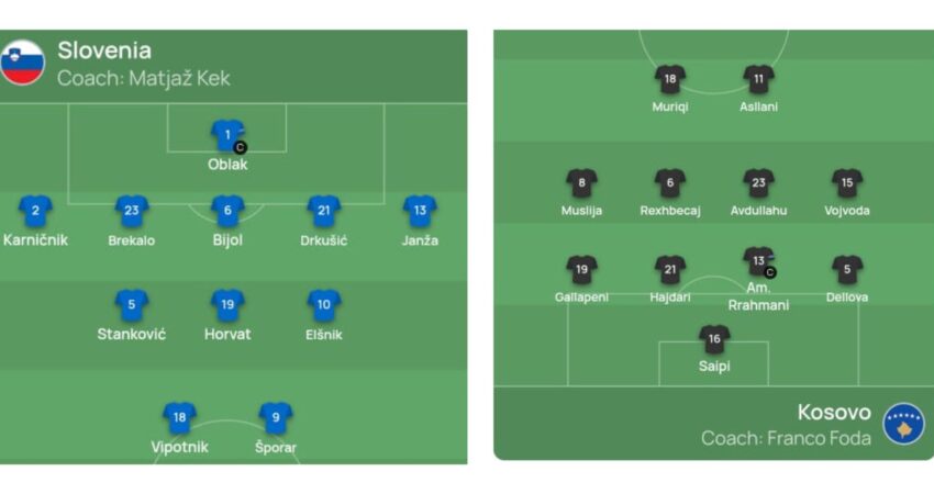 • Kosova: Saipi, Gallapeni, Hajdari, A. Rrahmani, Dellova, Vojvoda, Avdullahu, Rexhbecaj, Muslija, Asllani, Muriqi