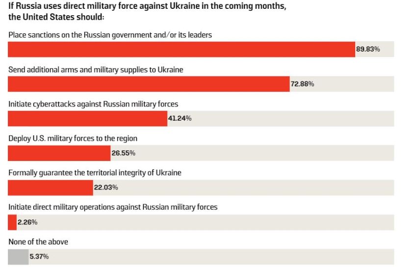 Rezultatet tregojnë mungesë oreksi midis ekspertëve për veprim të drejtpërdrejtë ushtarak kundër forcave ruse; më pak se 3 për qind e të anketuarve zgjodhën këtë opsion. Mjeti i zgjedhur i studiuesve të politikës së jashtme të IR-së duket se janë sanksionet: Gati 90 për qind e të anketuarve mbrojnë përdorimin e sanksioneve kundër Rusisë në rast të një pushtimi.