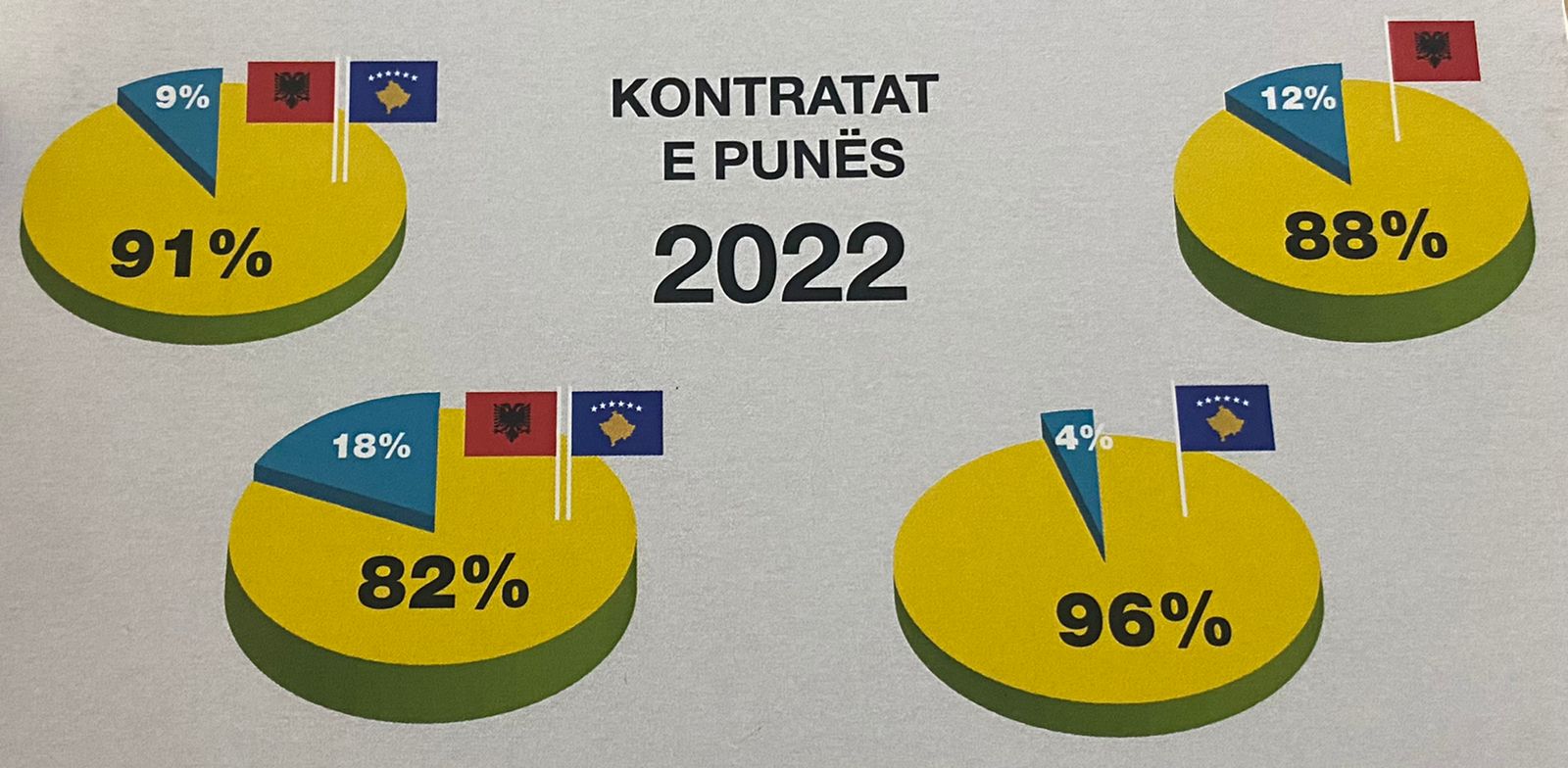 “96% e punonjësve në Kosovë deklarojnë se kanë një kontratë pune kundrejt 88% të punonjësve në Shqipëri duke lënë një segment relativisht të vogël të pambrojtur në marrëdhënien e punës, sipas Kodit të punës në Fuqi”, thekson sondazhi.