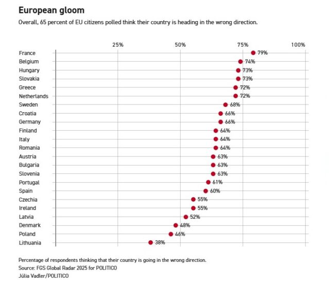 Në pothuajse çdo vend të anketuar, shumica besojnë se vendi i tyre po ecën në drejtimin e gabuar. Përjashtim bëjnë Polonia, Lituania dhe Danimarka — edhe pse këto vende janë ndër më të ekspozuarat ndaj Rusisë ose, në rastin e Danimarkës, ndaj presionit amerikan për Groenlandën.