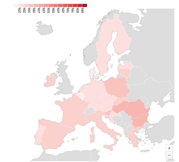 Vendet nordike, në përgjithësi më pak pesimiste, shënuan rezultatet më pozitive. Mendimet negative ishin më të larta në Rumani (91 për qind), Greqi (88 për qind) dhe Bullgari (86 për qind).