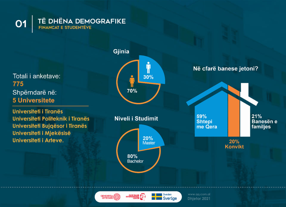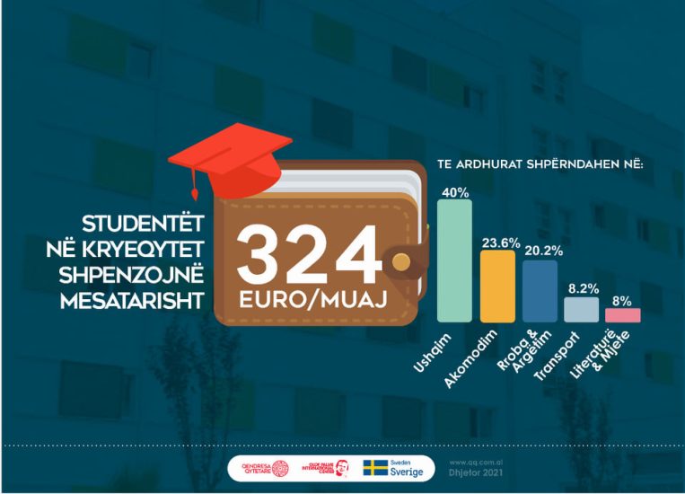 Një studenti që vjen nga rrethet për të studiuar në kryeqytet, mesatarisht i duhen 366 euro në muaj për të përballuar jetesën e tij. Këto janë të dhënat e nxjerra nga organizata jofitimprurëse “Qëndresa Qytetare”, me anë të një sondazhi tek 775 studentë nga 5 universitete të Tiranës.
