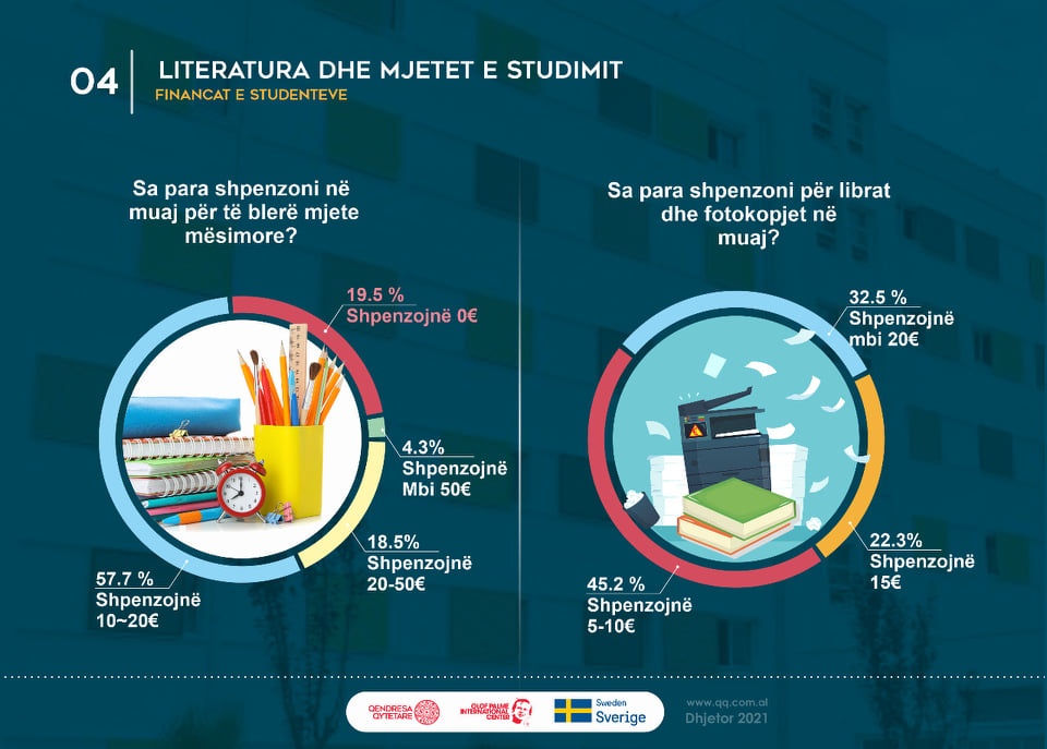 Të dhënat tregojnë më tej se në portofolin studentor janë librat. Nga gjetjet rezulton se 45.2% e studentëve shprehen se shpenzojnë nga 6 deri në 16 euro në muaj për literaturën dhe 57.7% e tyre pohojnë se shpenzojnë 10 deri në 20 euro në muaj për mjetet mësimore.