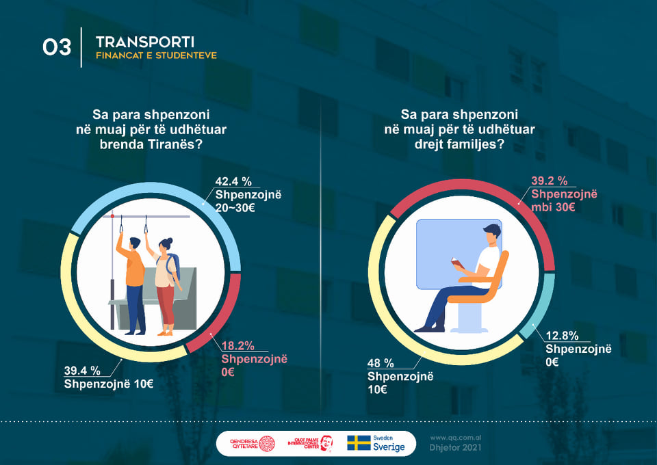 Po ashtu transporti është një nga nevojat kryesore të studentëve në Tiranë. Të dhënat tregojnë se 70% e studentëve shpenzojnë 10 deri në 20 euro në muaj për të udhëtuar jashtë Tiranë dhe po kaq edhe për transportin brenda për transportin urban.