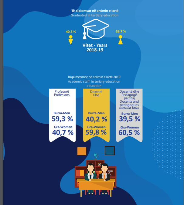 Të dhënat e INSTAT tregojnë se numri i të diplomuarve në arsimin e lartë në vitin akademik 2018/19 ishte afërsisht 35 mijë studentë ndër të cilët vajzat përbënin 66,4 %. Numri i të diplomuarve vajza në krahasim me një vit më parë është rritur me 6,6 %.
