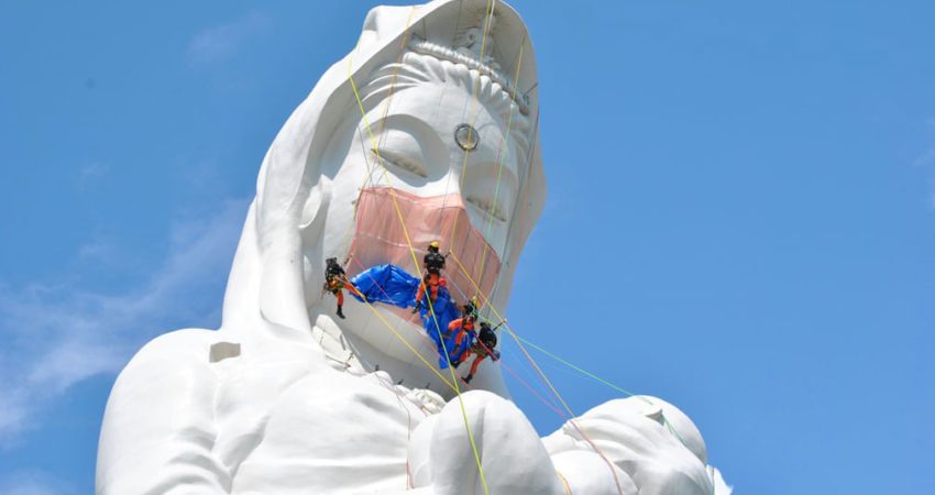 Punëtorët kanë vendosur një maskë në një statujë të perëndeshës Budiste 57 metra në Japoni, për t’u lutur për fundin e pandemisë së koronavirusit.\The Guardian\