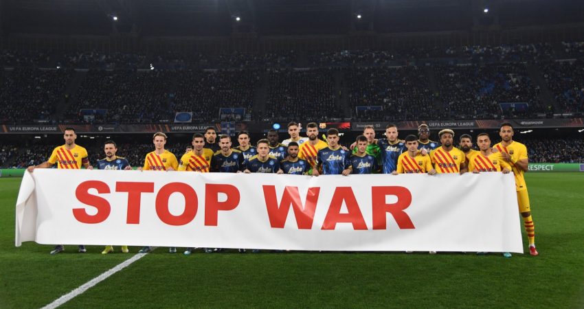 Një gjest i bukur ka ardhur nga lojtarët e Napolit dhe Barcelonës. Para ndeshjes së Ligës së Europës në “Maradona” ata janë bashkuar në qendër të fushës dhe kanë hapur një parullë, ku shkruhej ‘Stop War’ (Stop luftës). Një mesazh kundër pushtimit të Ukrainës nga Rusia.