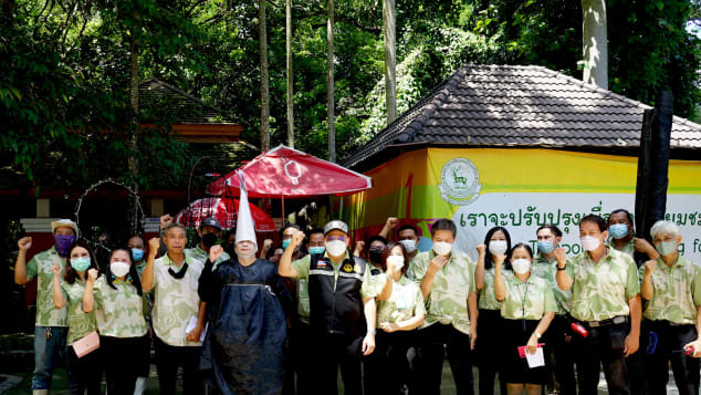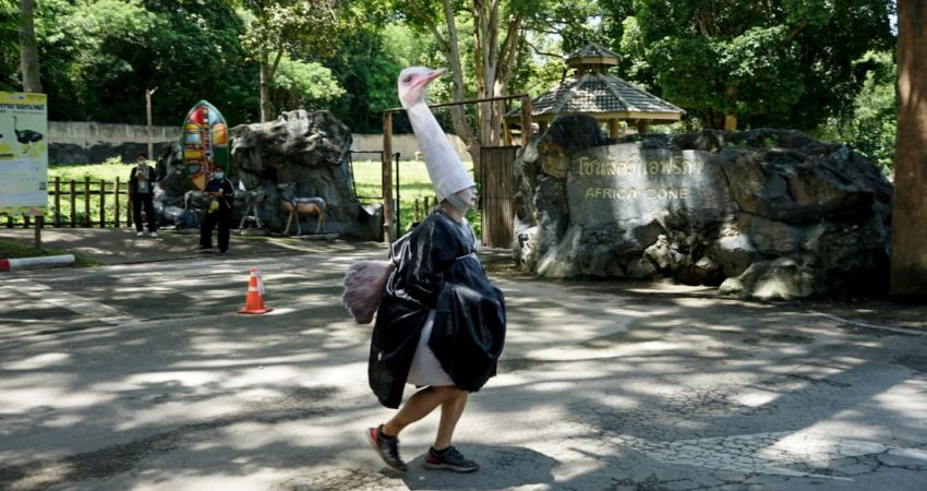 Ky është një burrë i rritur, me kostumin e plotë të strucit dhe detyra e tij është të ndihmojë në trajnimin e stafit në kopshtin zoologjik Chiang Mai se si të përgjigjen nëse një kafshë arratiset.
