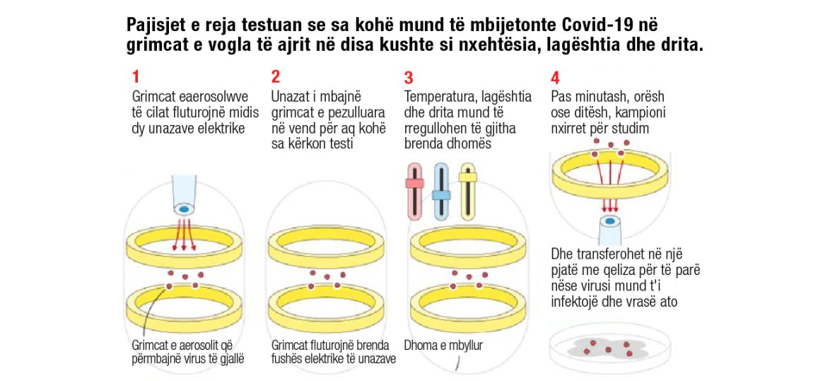 Studiuesit nga Universiteti i Bristolit zhvilluan aparate që i lejuan njerëzit të gjeneronin çdo numër grimcash të vogla që përmbajnë viruse dhe t’i ngrinin butësisht ato midis dy unazave elektrike për diku nga pesë sekonda deri në 20 minuta, ndërsa kontrollonin fort temperaturën, lagështinë dhe rrezet ultraviolet.