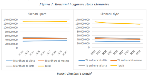 Rezultatet nga skenari i parë “i vazhdimësisë”, parashikojnë një nivel të qëndrueshëm konsumi, ndërkohë që normat më të larta të akcizës në skenarin e dytë pritet që të sjellin ulje të ndjeshme të konsumit të cigareve.