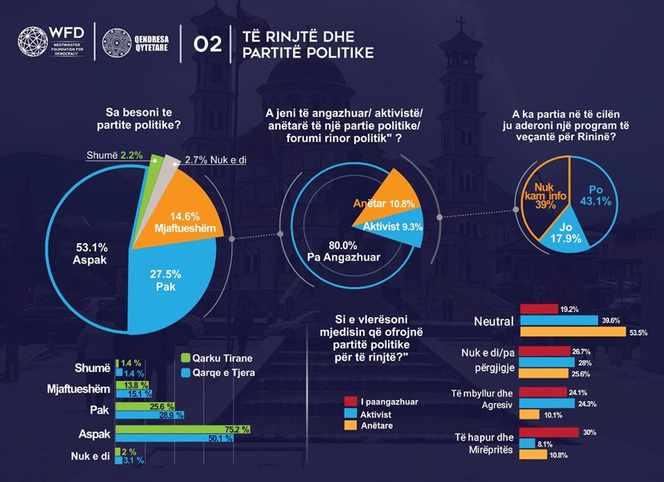 Studimi u realizua me anë të një pyetësori drejtuar të rinjve në 61 bashkitë e vendit. Për sa u përket pyetjeve për bindjet politike dhe preferencat partiake, shumica e të rinjve duken të tërhequr nga partitë politike dhe një numër i paktë beson tek ato, rreth 17 përqind. Përkundrazi, pjesa më e madhe e tyre shprehen të pakënaqur për situatën aktuale politike ne vend.