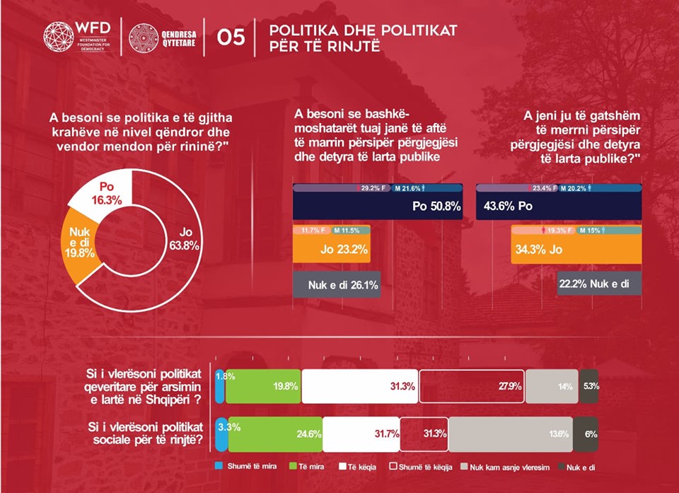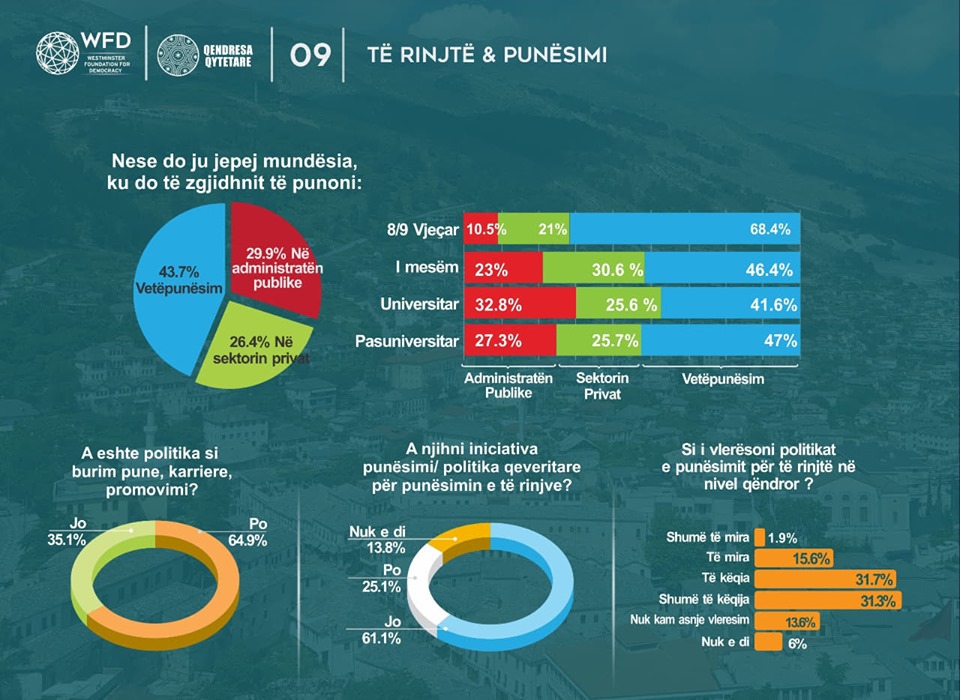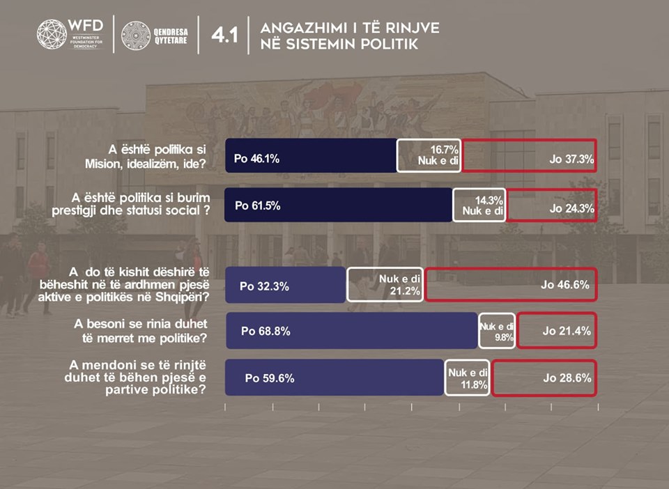 Të dhënat treguan gjithashtu se rreth 70% e të rinjve shqiptarë mendojnë se rinia duhet të merret me politikë, por vetëm 32% e tyre duan të bëhen pjesë aktive e politikës. 62% e të rinjve e shohin angazhimin në parti si prestigj. Sipas Mërtirit, edhe vetë të të rinjtë shfaqin probleme të shumta. Ata vetë duken të papredispozuar të punojnë e derdhin djersë për të krijuar një të ardhme të mirë dhe shumica e tyre as që e ka të qartë se çfarë pritshmërishë duhet të kenë ndaj saj. Shumë prej të rinjve priren të emigrojnë por pa u përpjekur të përvetësojnë asnjë aftësi për t’i ndihmuar të çajnë në në jetë të re në emigrim. Ata e mendojnë emigracionin vetëm si varkë shpëtimi, pa asnjë ide të qartë sesi do ta ndërtojnë të ardhmen e tyre atje. Duke vijuar në spektrin politik, rreth 76 përqind e të rinjve nuk kanë kontaktuar asnjëherë me përfaqësuesin që kanë zgjedhur, ndërsa 39 për qind as që e njohin deputetin e zonës. Ndërsa, për sa i përket punësimit 70% e të rinjve janë shprehur se do të zgjidhnin vetëpunësimin ose sektorin privat si mundësi pune dhe vetëm 30% e tyre, dëshirojnë të punojnë në administratën publike.