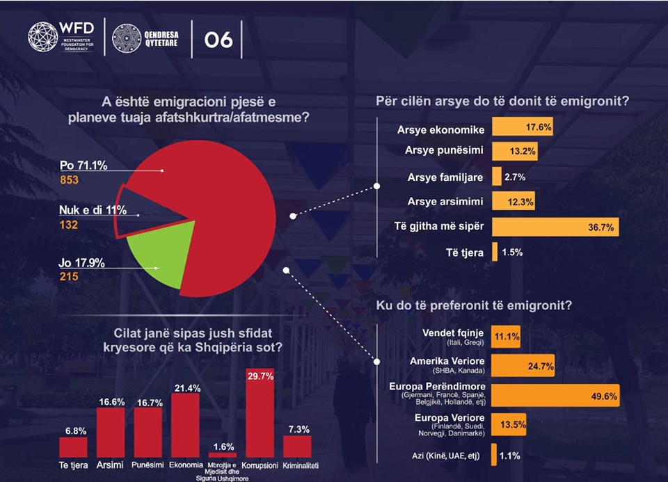 Pjesa më e madhe e tyre rreth 55 për qind, dëshirojnë të largohen për një sërë arsyesh siç janë pamundësia ekomomike, mungesa e punësimit dhe arsimi i dobët, ndërsa për pjesën tjetër një faktor, rreth 37 përqind, kanë cilësuar se arsyet kryesore të largimit janë korrupsioni dhe kriminaliteti.