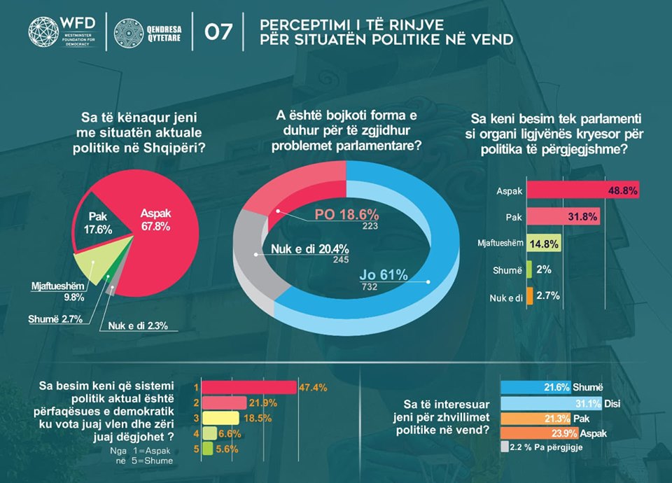 Sociologu Gëzim Tushi shprehet se sondazhi i lidhur me raportet që kanë të rinjtë me politikën në Shqipëri, në thelb tregon për një lloj krize ekzistenciale në raport me të rinjtë tanë me politikën. Sipas Tushit kjo parashtrohet në dy anë. Nga njëra anë ka problemin e një lloj skarciteti që ka politika shqiptare, një problematike që është bërë e pakëndshme për të rinjtë , të cilët kanë pritshmëritë e tyre. Ai shpjegon se cilido pret nga politika për të zgjidhur problemet që ka rinia dhe jeta shoqërore, ekonomike dhe politike në vendin tonë.