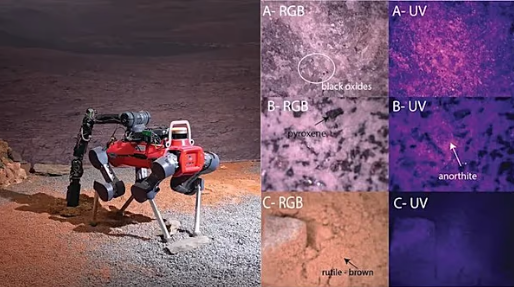 I lidhur në trupin e robotit me katër këmbë, i quajtur ANYmal, është një krah robotik që mban një aparat fotografik mikroskopik dhe një spektrometër Raman- një skaner që mund të lexojë dhe identifikojë gjurmën kimike të një shkëmbi.