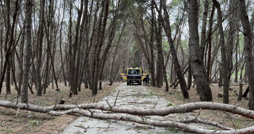 Është dashur ndërhyrja e zjarrfikëses për të hequr pemët e rrëzuara nga një zonë, pasi ishte bllokuar rruga për qarkullimin e automjeteve.