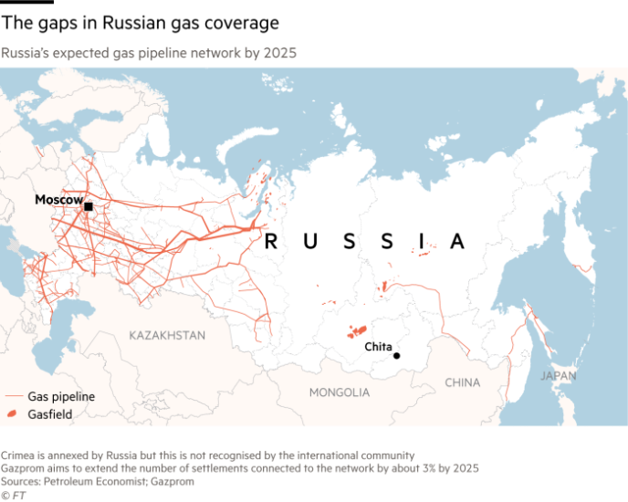 Megjithëse Rusia është eksportuesi më i madh i gazit në botë, ajo ka luftuar për të lidhur masën e saj të madhe tokësore me rrjetin e brendshëm. Zona të tëra janë lënë pas.