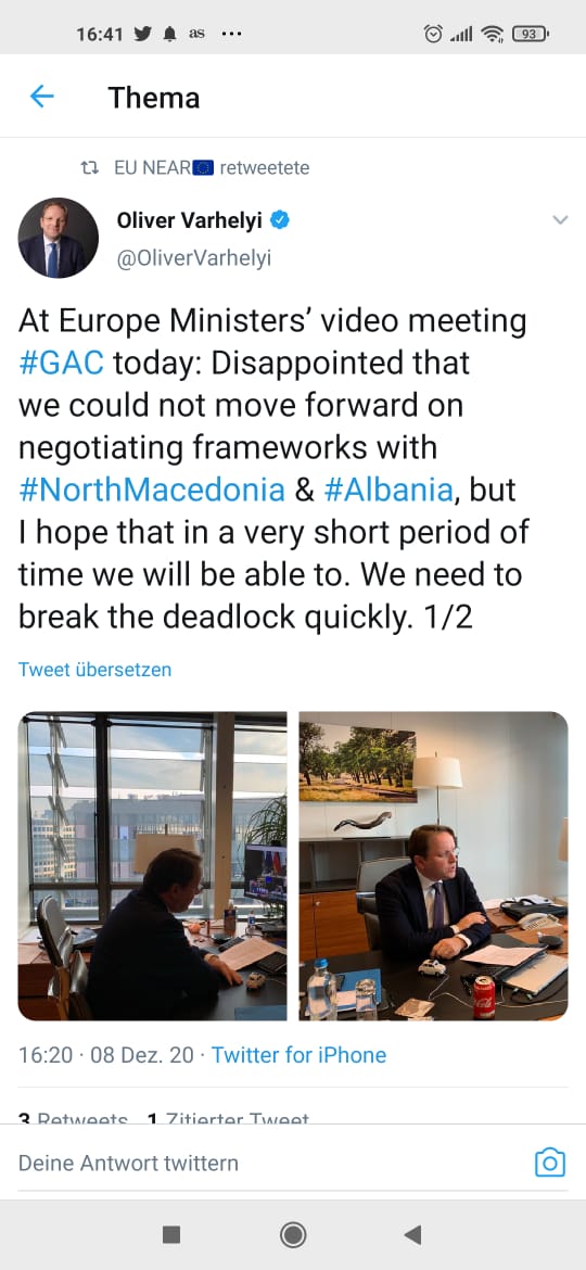 “Në takimin virtual të ministrave të jashtën të BE-së, sot. I keqardhur që nuk mund të avanconim me bisedimet për negociatat me Maqedoninë e Veriut dhe Shqipërinë, por unë shpresoj që në një kohë shumë të shkurtër kjo të ndodhë. Kemi nevojë ta thyejmë akullin”, ka shkruar Komisioneri në llogarinë e tij.