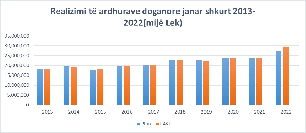 Të dhënat zyrtare tregojnë se të ardhurat progresive nga doganat ne dy muajt e parë të vitit 2022 janë realizuar në masën 29.6 miliardë lekë nga 27.6 miliardë lekë të planifikuara ose rreth 2 miliardë lekë më shumë. Në krahasim me 2-Mujorin 2021 janë realizuar rreth 5.8 miliardë lek më shumë.