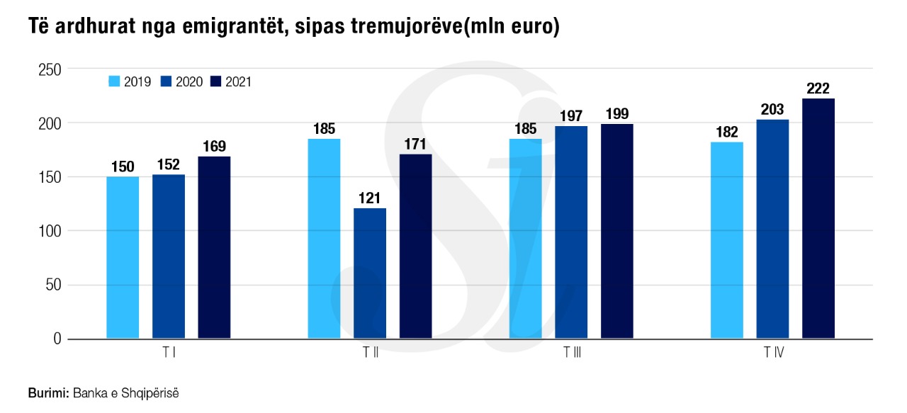Sipas tremujorëve, niveli më i lartë i tyre u shënua në korrik-shtator, me 200 milionë euro, dhe në tremujorin e fundit me 222 milionë euro, që përkojnë me periudhën e verës dhe fundin e vitit, kur shumë emigrantë vijnë për pushime.