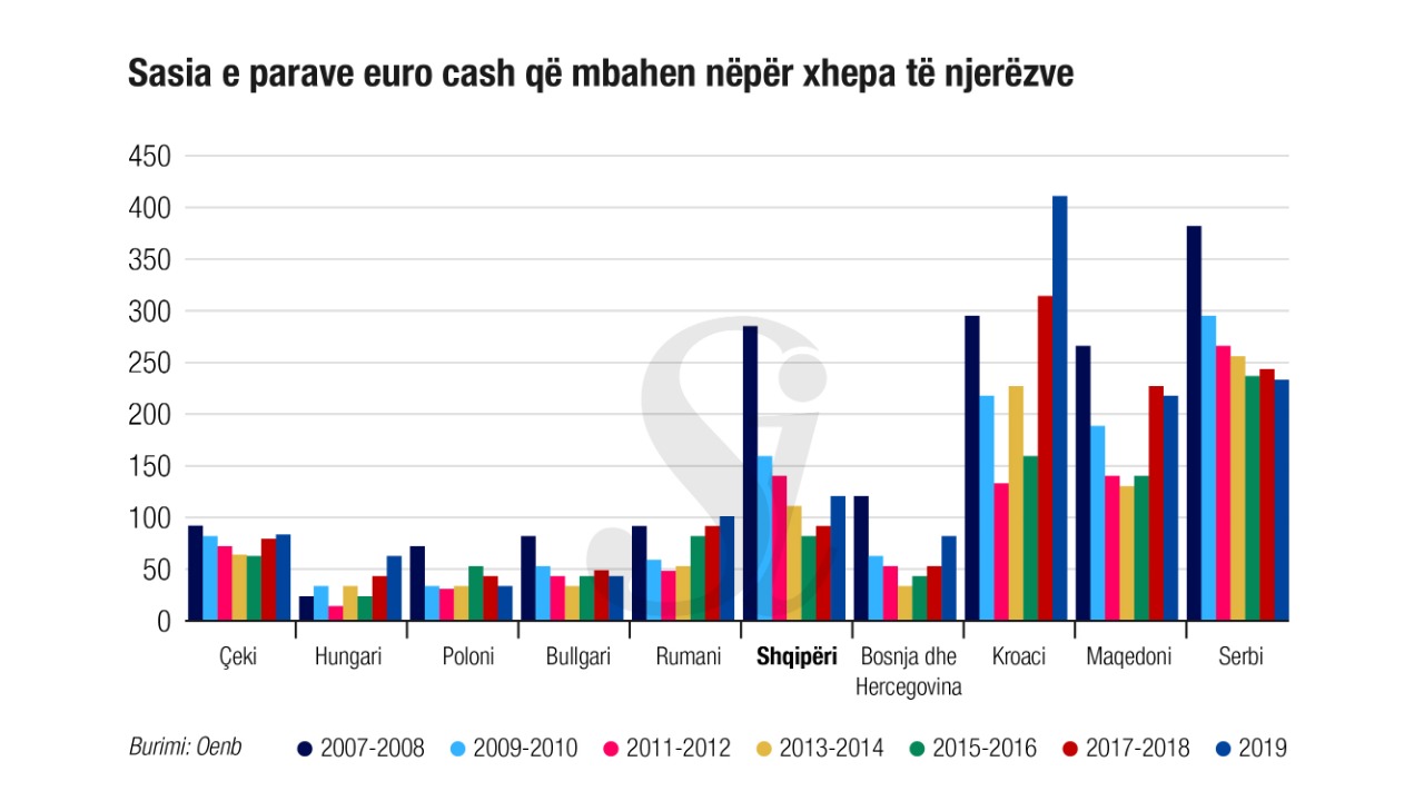 Në vendin tonë shihet një rritje e përhapjes së përdorimit të euros nga viti 2007 ku ishte rreth 32% e deri në vitin 2019 ku përhapja e saj në vendin tonë arrinte shifrat e 35%. Shqipëria zë vendin e dytë për përdorimin e euros në rajon pas Kroacisë dhe Serbisë. Gjatë viteve 2007-2008 shqiptarët udhëtonin me afër 300 euro në xhep, ndërkohë që në vitin 2019 kjo vlerë ishte rreth 120 euro. Vendi ynë renditet pas Maqedonisë, Kroacisë dhe Serbisë.