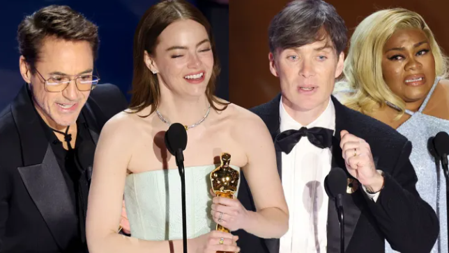 Fituesit e natës përfshinin Robert Downey Jr. në kategorinë Aktori më i mirë në rol dytësor për punën e tij në Oppenheimer të Christopher Nolan. Downey Jr fitoi Oscarin e tij të parë sonte pasi u nominua tre herë në Academy Awards.