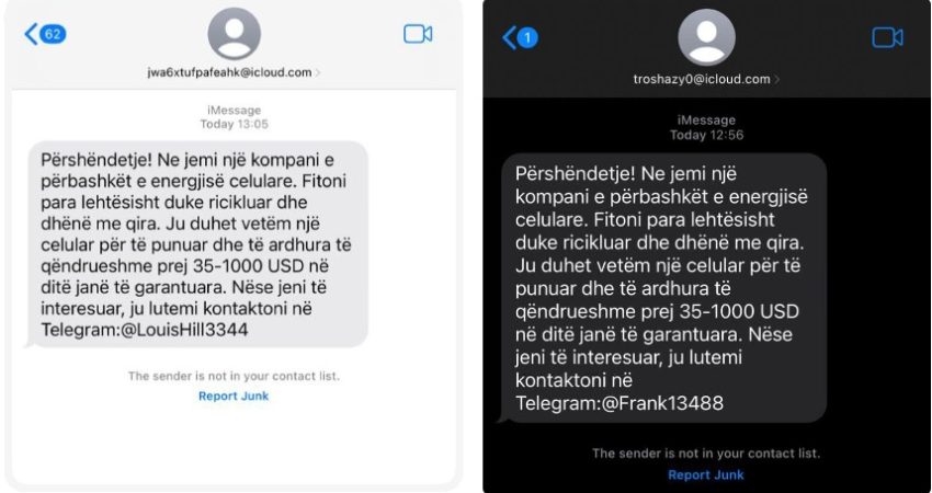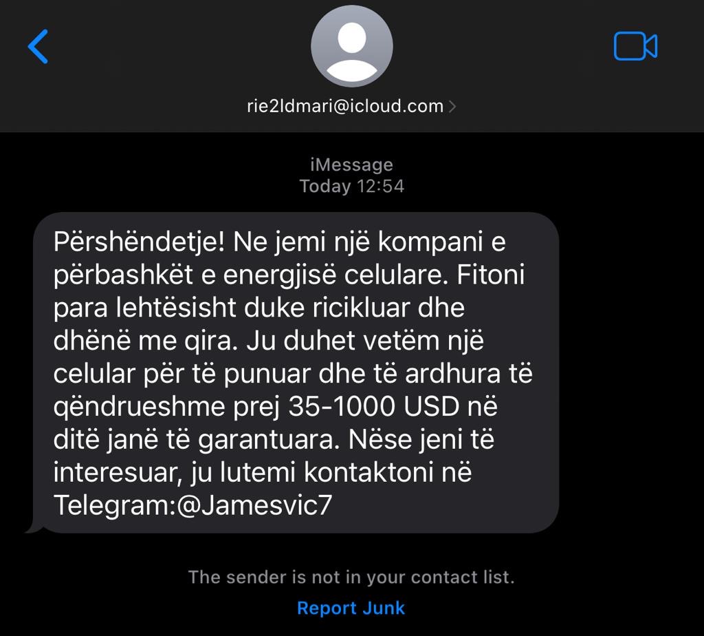 “Nga monitorimi i vazhdueshëm i hapësirave virtuale, në rrjete sociale, me qëllim evidentimin e veprimtarive të kundraligjshme, kryesisht në fushën e krimeve kibernetike, specialistët e Sektorit për Hetimin e Krimeve Kibernetike në DVP Tiranë, kanë konstatuar se në mënyrë të përsëritur, kryesisht përdoruesve që përdorin pajisje komunikimi “Apple”, u dërgohen me iMessage, mesazhe nga adresa ndryshme iCloud.