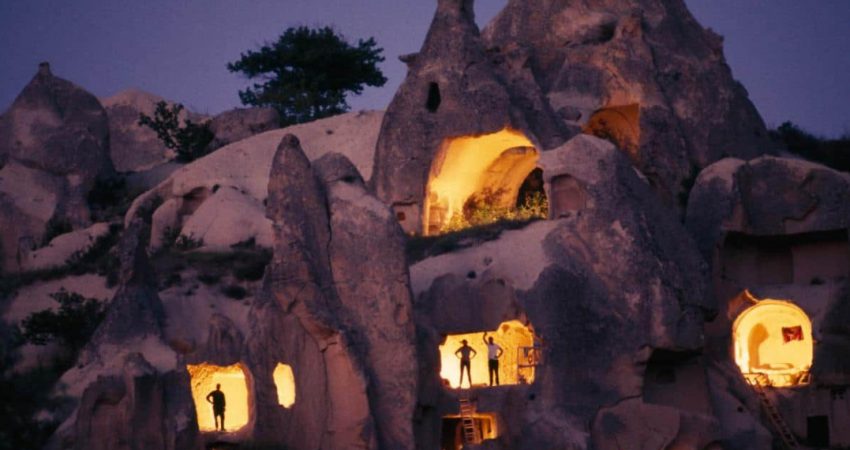 Fotografi Jonathan Blair, gruaja e tij Arlene dhe një mysafir janë shfaqur duke pozuar në hapjet e një shpelle në Kapadochia, Turqi. kjo është një ngjarje e rrallë pasi çifti jetoi në shpellë për një muaj duke ndjekur gjurmët e banorëve që kanë jetuar aty për shekuj.