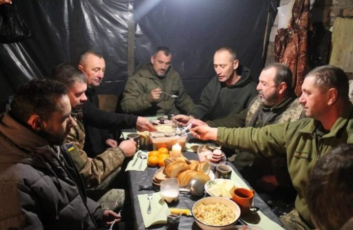 Disa foto të shpërndara nga ushtria e Ukrainës tregojnë një grup ushtarësh të mbledhur rreth tryezës në vigjilje të Krishtlindjes.